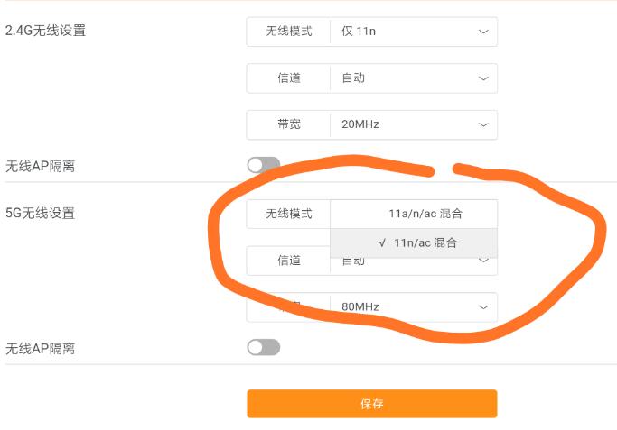 如果选择11n/ac模式,一般来说现在的终端都是可以连接上的,在最高传输速率上也和11a/n/ac模式是一样的,不存在网速的差别。但如果你有一个只支持11a协议的设备的话,在11n/ac模式下是连不上WIFI的,更别提上网了。另外一个你会发现在不同路由器上的5G设置无线模式上都是差不多的,但默认都是混合模式,其实也是为了最大程度上做到能兼容所有的5G协议让大部分的终端都能连接上来。至于为什么要单独设置不同的模式只是为了一些特定场合调试或者方案实施上才选择其他模式。