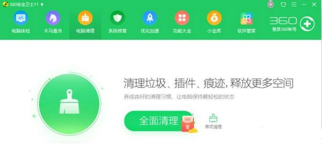 点击安全卫士中的电脑清理菜单,点击全面清理按钮,可以自动对电脑中的垃圾、插件、使用痕迹进行自动清理。