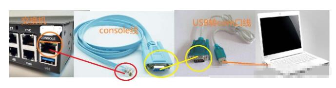 1.首先将console线跟usb转com口线接好,将usb口接入笔记本,并在笔记本上安装好com口线的驱动,console线的RJ45口接交换机党nsole口,就完成了物理线路的连接。