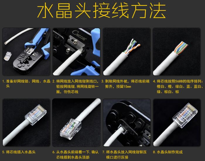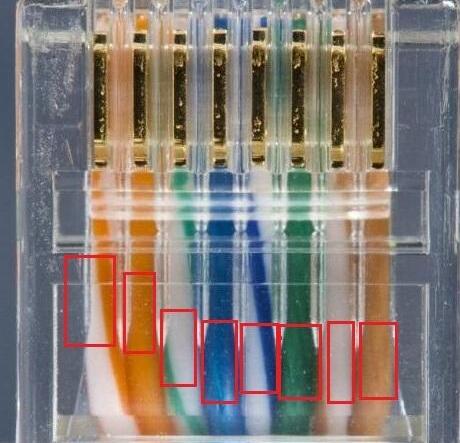 1.压线之前,把线序整理好插入水晶头,这时肉眼检查线头是否已经顶到水晶头顶端,检查线序是否按照标准的568B线序,没有问题,压好。一般不会有问题。检查线序是否正确:橙白,橙,绿白,蓝,蓝白,绿,棕白,棕。