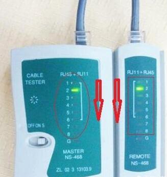 2.使用测线仪测试线序及压线质量,正常的网线测试时测线仪两个的线序1到8同时顺序下跳,如果某一线有问题或者没压好,会出现两边不同步跳动,或者某一个灯不亮,说明制作有问题,就要仔细检查线序,或者重新压线。