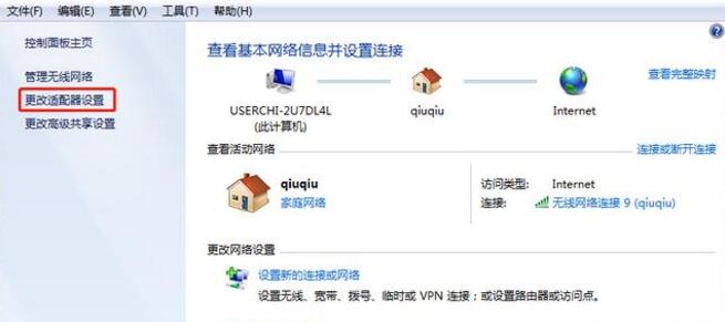 2.在弹出的“网络和网络共享中心”窗口,点击“更改适配器设置”;