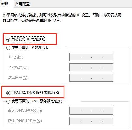4.在弹出窗口,分别勾选“自动获得IP地址”、“自动获得DNS服务器地址”;