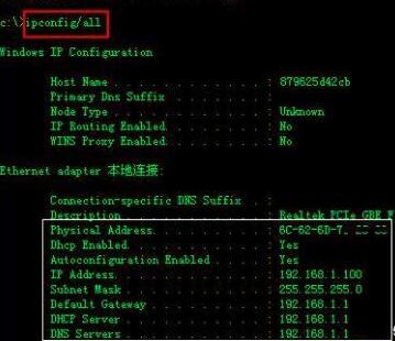 在DOS窗口输入“ipconfig/all”命令,可以查看到电脑端的MAC地址;下图中的“physical Address”则为电脑的MAC地址。