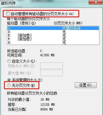 默认,系统虚拟内存设置在系统盘中,可以将虚拟内存更换到其他盘符,节省系统空间,在系统的虚拟内存设置中,点击“无分页文件”,释放虚拟内存,并添加至其他盘符。