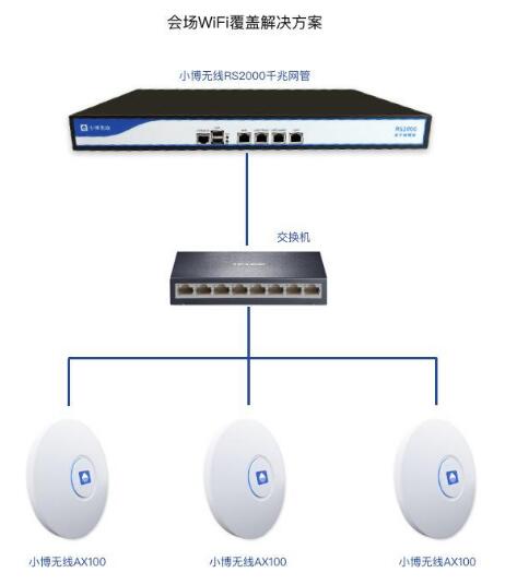 会场覆盖的主要难度是同时上网人数过多,可以使用小博无线的AC+AP覆盖方案,根据会场大小,上网人数来决定使用AP的数量,以市面上常用且性价比较高的小博无线路由器为例,一个200人的会场建议使用1个AC+3个AP,若是1000人的会场建议使用1个AC+20~25个AP,【AC可以使用小博无线的RS2000,AP可以使用小博无线的AX100】,拓扑图可参考。xw2018901xunji