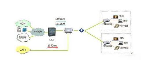 运营商端基站使用OLT设备进行数据的汇总和传输,中间通过无源光网络进行组网,使用分纤器进行分光,用户端通过光猫设备进行连接,可以传输语音、网络、IPTV电视等多种业务,用户端使用路由器和光猫进行连接,支持路由功能的光猫可以无需连接路由器设备,用户端通过有线或无线的方式同路由器进行连接,最终实现上网。