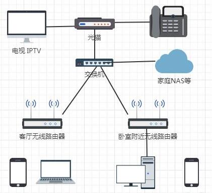 目前,基本上已经普及了光纤入户,运营商端入户的光猫设备建议放置在弱电箱中;无线路由器为了避免信号的影响,不要放置在弱电箱中;弱电箱中增添交换机设备,通过交换机最为数据汇聚;路由器建议方式在客厅的电视旁,电视通过无线和光猫瞪鯬TV口进行连接;可以根据室内空间大小,选择是否增添其他的无线路由器设备进行覆盖。