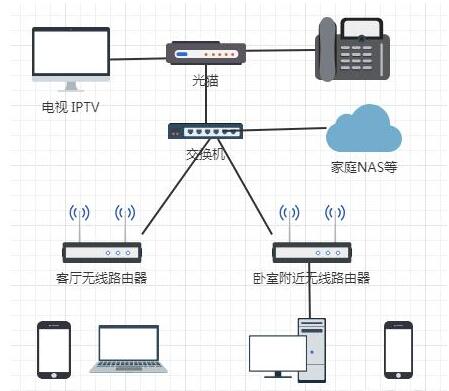 弱电箱中放置的设备有:运营商端的光猫、用户端交换机作为网络的汇聚设备,客厅的电视若需要通过IPTV方式进行观看,则需要同光猫瞪鯬TV口进行连接,交换机上端和光猫进行连接,下端和卧室、客厅、书房的墙插网线连接,无线路由器建议放置在客厅,并通过墙插和交换机连接,提供设备的无线上网,其他房间若有上网需求,可以通过墙插或新增无线路由器解决。