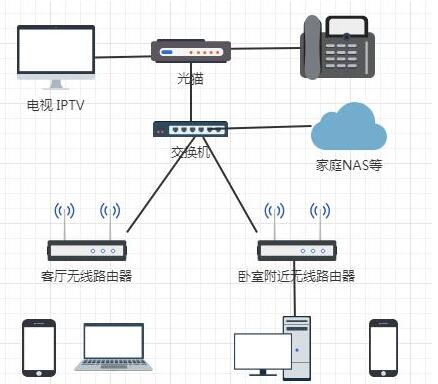 家庭中以弱电箱作为数据的汇聚点,将光猫和交换机分别放置在弱电箱中。两台路由器分别与交换机连接,通过光猫的路由器功能实现上网;两台路由器需要分别设置WAN口和LAN口的网关DHCP服务器等。