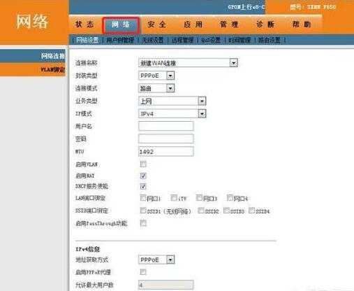 进入到光猫的登录页面,点击页面菜单栏中的网络按钮,在网络设置中,将封装类型选择为PPPoE拨号模式,依次在用户名和密码处填写运营商给你的账号和密码即可。