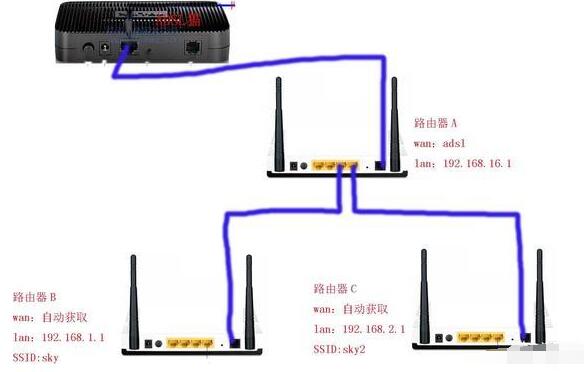 二级路由器的LAN口连接主路由器的LAN口,通过网线连接。切记二级路由器使用LAN口连接,而不是WAN口。