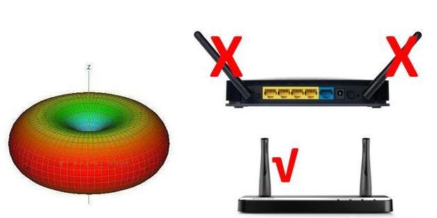原因分析:如下图所示,无线路由器天线辐射最强的是水平方向延升,而不是天线的顶部,天线顶部的信号是比较弱的。并不是天线指向哪里,哪里信号最强。