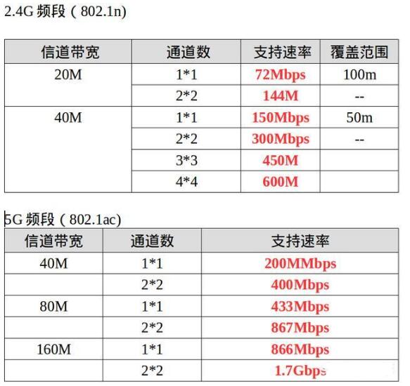 从下图可以看出,无线速度与无线频段、信道频段、通道数有关,无线频率越低,信道带宽越低,通道数越少,无线速率越低,但是覆盖范围越广;反之无线频率越高、信道带宽越高、通道数越多,无线速率越高,最高可达6.7G以上,但是覆盖范围越小;