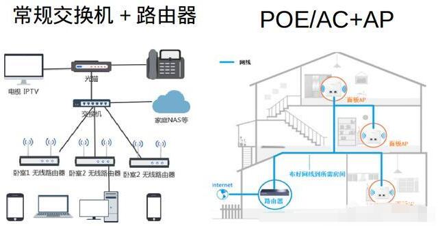 家庭网络布线完成之后,选择合适网络设备组网就可以了,提供两种方案,这里简要介绍,使用无线路由器组网,组网方式如下图左侧所示,多个无线路由器通过级联的方式实现组网,实现家庭无线WiFi的全覆盖,使用AC+AP的方式组网,组网方式如下图所示,每个房间放置一个AP面板连接到POE/AC路由器,通过AC管理器对每个AP进行相关的配置,实现家庭组网。