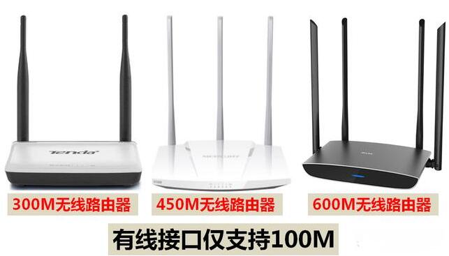300M,450M,600M无线路由器在外观上仅仅是天线数目的区别,300M路由器两根天线,450M路由器3根天线,600M路由器4根天线;
