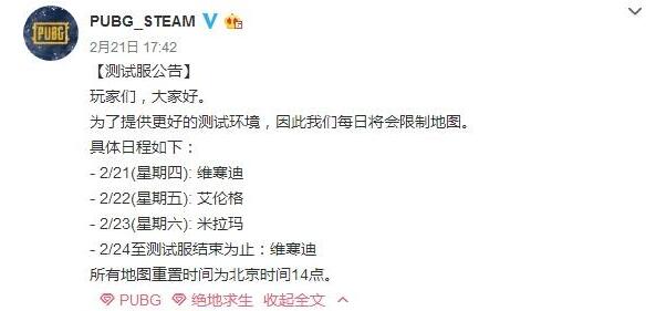 总的来说这只是测试服的公告:未来PUBG测试服每日会限制地图刷新,如周四维寒迪地图、周五艾伦格地图、周六米拉玛地图。这仅仅是测试服的公告(平时没人玩测试服吧),因此这种限制地图的方式不会在正式服上线。而限制地图的目的也是为了更方便的采集数据,每天专注于一张地图的测试,正式服肯定不可能这么做的。