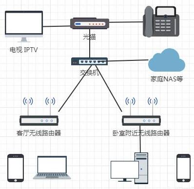 中户型可以使用下图的网络结构进行布局,光猫网口足够的前提下无需使用交换机。光猫放置在弱电箱中,并通过汇聚网线同各个房间的路由器进行连接;各房间的无线路由器通过墙插网线和光猫建立连接。通过该方法,每个房间可以更加灵活的添加无线路由器设别。xunji20190301